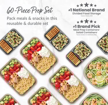 This 60‑piece kit includes ten one‑compartment trays, ten prep bowls and ten two‑compartment snack trays, giving you the flexibility to prepare a week’s worth of breakfasts, lunches, snacks and dinners. The custom‑fit lids keep food fresh and stack neatly to save space.