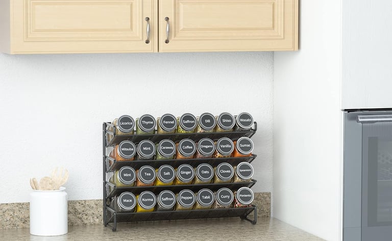 Once installed, wall mounted racks keep every jar visible and encourage rotation. They require screws or adhesive and are not easy to move once installed. Countertop racks require no mounting and can be used straight out of the box. They’re ideal for renters or those who like to reorganize frequently. They also sit at counter level and add visual clutter.